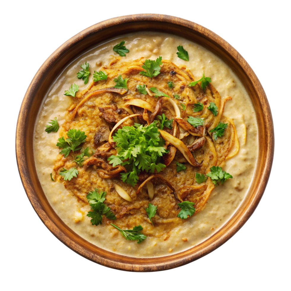 Slow-cooked blend of lentils, wheat, and meat topped with crispy onions